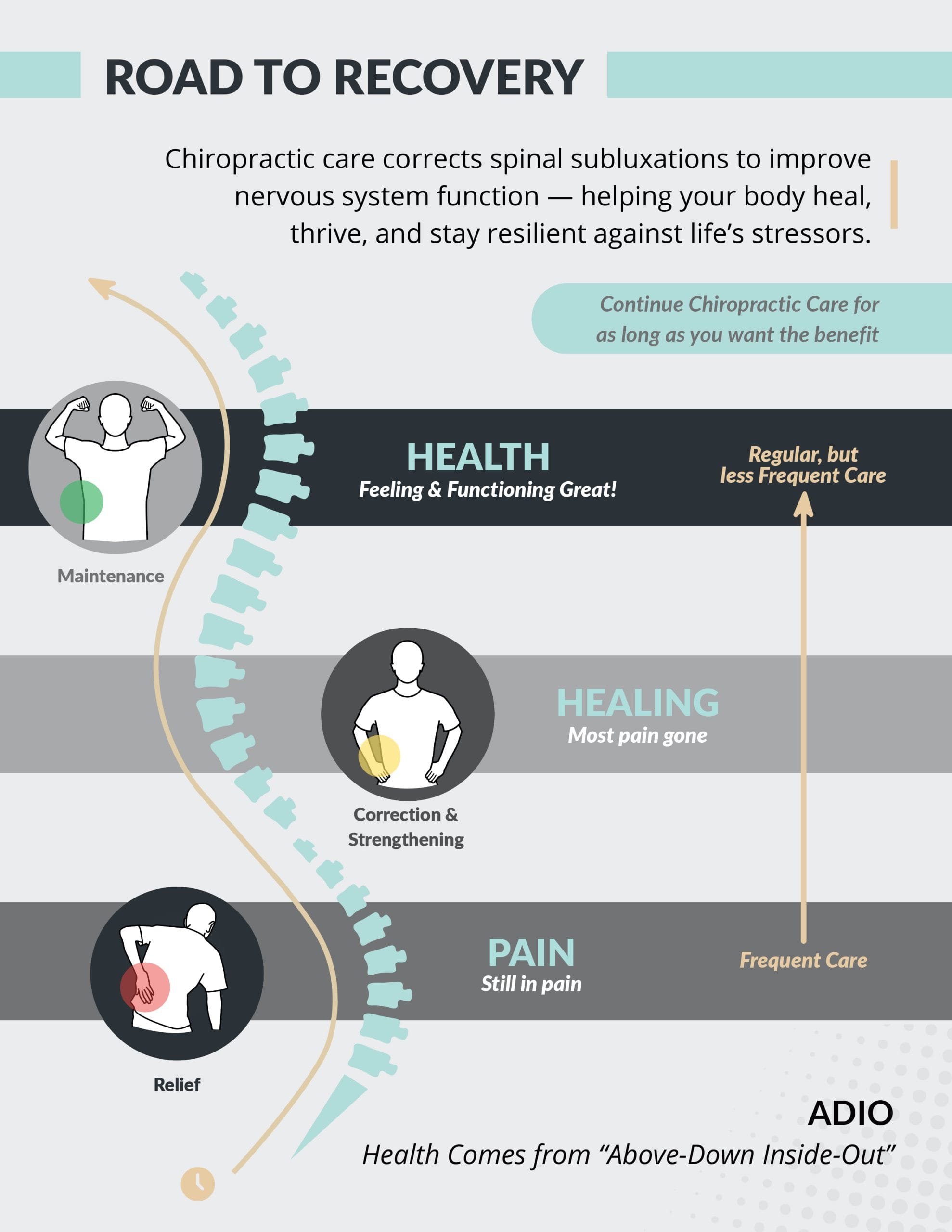 Pain Relief → Healing & Correction → Health & Maintenance (as shown in your Road to Recovery poster).